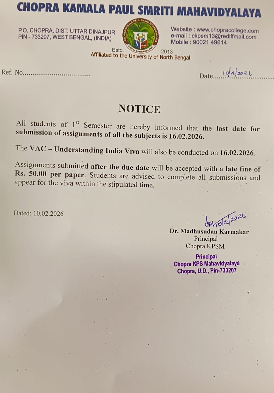 Chopra Kamala Paul Smriti Mahavidyalaya, P.O. Chopra, Dist. Uttar Dinajpur, West Bengal, India-733207