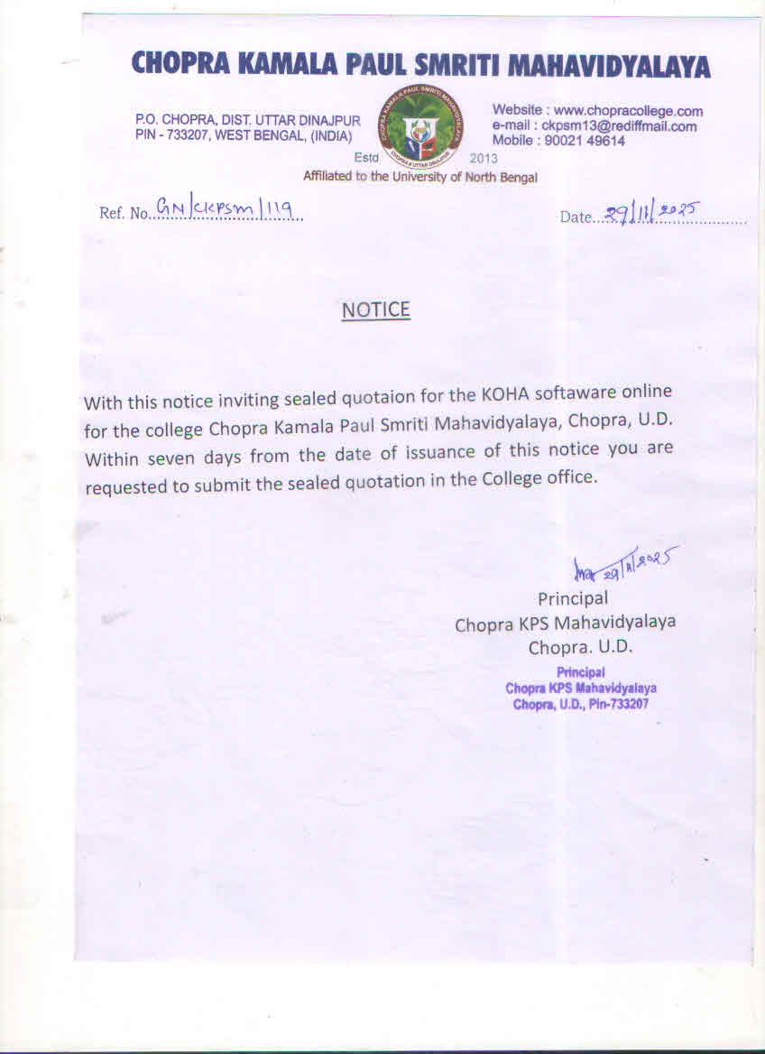 Chopra Kamala Paul Smriti Mahavidyalaya, P.O. Chopra, Dist. Uttar Dinajpur, West Bengal, India-733207